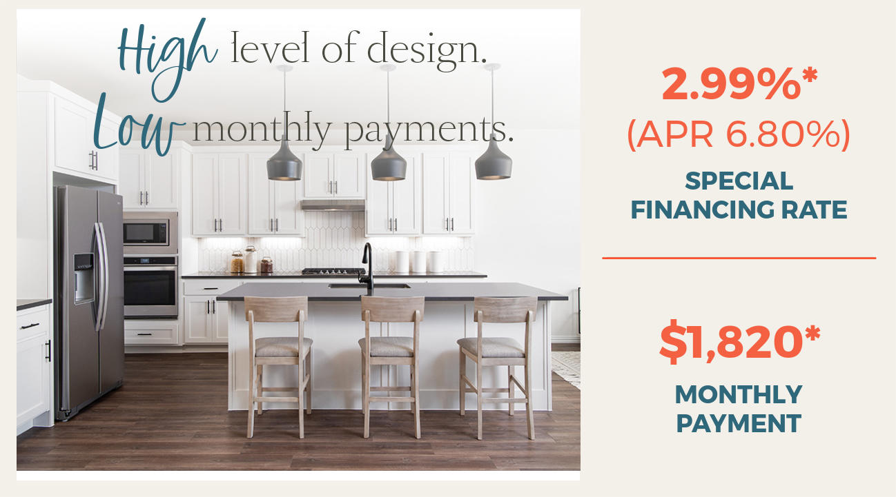 Ashton Woods has built a reputation for creating expertly designed, inspired homes. And right now, we are making it more affordable than ever to enjoy the design you'll love at a lower monthly payment. Enjoy $1,820 a month for the first year of your loan when you lock in today's 2.99% special financing rate. With inventory still at historic lows and interest rates continuing to fluctuate, now is the time to jump on this opportunity. One call or click. One year of low payments. A lifetime of memories.